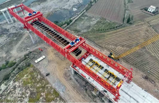 沁河特大橋采用跨河裝配式鋼混組合設計,創(chuàng)新使用特大型架橋機,成功實現(xiàn)了80米跨度鋼箱梁的雙幅整孔架設。天業(yè)通聯(lián)研制的新型特大架橋機LG450T80M作為該項目的核心施工裝備,全程保駕并出色完成了全部鋼箱梁的架設任務。無論是在鋼結構橋梁的應用與架設施工方面,還是在橋梁裝配式建造的工業(yè)化進程方面,沁河特大橋的順利完工都標志著我國橋梁施工技術的一次重要歷史性突破。