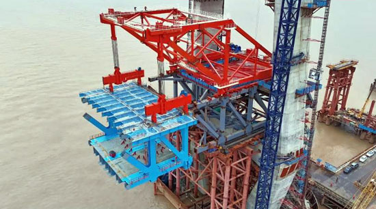 發(fā)布日期:2025-06-09? ? ? ? 6月8日,由中鐵大橋局承建的滬渝蓉高鐵滬寧段V標(biāo),崇啟公鐵長江大橋主通航孔橋首節(jié)鋼梁成功吊裝。中鐵大橋局作為中國橋梁建設(shè)的“國家隊(duì)”,具有豐富的橋梁施工經(jīng)驗(yàn),幾十年來在跨江、跨海、跨峽谷等極端環(huán)境下的橋梁施工中創(chuàng)造了多項(xiàng)世界紀(jì)錄和技術(shù)突破。此次施工中,中鐵大橋局與天業(yè)通聯(lián)合作研發(fā)新型TLJ1100架梁吊機(jī),該設(shè)備為項(xiàng)目建設(shè)的順利推進(jìn)提供了關(guān)鍵性的保障。