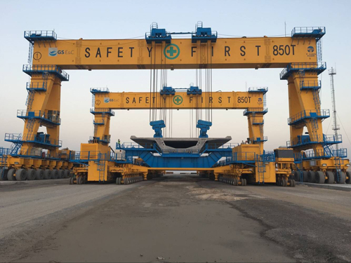 由我司為GS提供的一臺1700t架橋機,2臺850t提梁機,4臺425t運梁車以及門吊等設(shè)備,在多哈大橋的施工建設(shè)中發(fā)揮了關(guān)鍵性的作用,業(yè)主單位科威特公共交通事業(yè)部、施工單位GS建設(shè) 以及監(jiān)理單位對我司設(shè)備和現(xiàn)場服務均表示高度認可。